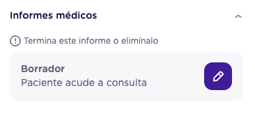 Ahora toda la información que vayáis añadiendo al informe médico se quedará guardada en un primer borrador, podréis navegar por toda la plataforma y volver de nuevo al informe para seguir editándolo antes de enviar. Recuerda que una vez completado el campo de CIE-10 se habilitará el botón para finalizar el informe y enviarlo al paciente.