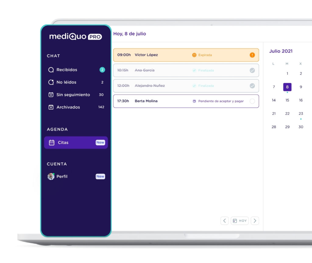 A simple vista podrás visualizar por orden cronológico las citas con el nombre de cada paciente que se encuentran pendiente de aceptar y/o pagar, así como las finalizadas o expiradas.